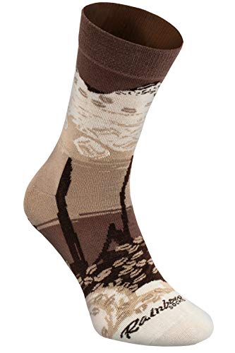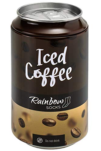 SOCKEN WIE KAFFEE – jeden Morgen beginnst du mit einem Kaffee? Jetzt kannst du deine Liebe zum Kaffee in einer außergewöhnlichen Weise zeigen! Es reicht, wenn du morgens unsere Iced Coffee Socks anziehst. Greif nach dieser reizenden Dose Kaffee. Keine Sorge, du frierst nicht, sondern du entdeckst mit Erstaunen, dass dich eine Überraschung erwartet! Drin sind witzige Socken versteckt, mit einem Muster von Schichten von Milchkaffee, Eiswürfeln, Schokoladensoße und Schlagsahne. Hmm!. EIN GESCHENK FÜR KAFFEELIEBHABER - Iced Coffe Socks in der Dose ist ein hervorragendes Geschenk für alle Kaffeetrinker. Es gibt ihnen Energie, ohne den Blutdruck zu erhöhen – es enthält kein Coffein ???? Das ist also eine Portion Kaffee für alle, die ein Paar Tassen Kaffee jeden Tag trinken. Vielleicht hast du in deinem Freundeskreis einen Kaffeemacher? So eine Kaffeesorte hat er bestimmt noch nicht ausprobiert! Die Socken gibt es in zwei Größen: für Frauen (EU 36-40) und für Herren (41-46).. WIE SERVIERT MAN COFFEE SOCKS? – Kaffeesocken kannst du einem Freund auf verschiedenen Weisen anbieten. An einem heißen Sommertag ist es am besten, sie zuerst in den Kühlschrank zu stellen und abwarten, bis sie kalt in die Hände des Beschenkten geraten. Wenn das aber ein Date im Café ist, kannst du die Socken in ein hohes Glas hineingießen und damit ein bisschen Humor geben. Außer dem Spaß bei der originellen Ausgabe, finden unsere Socken eine praktische Anwendung – an den Füßen des Beschenkten.. EINE AUSSERGEWÖHNLICHE VERPACKUNG – Die Dose, in der Coffee Socks von Rainbow Socks eingepackt sind, ist eine fertige und ästhetische Geschenkverpackung. Man muss sich nicht um das Geschenkpapier kümmern, was besonders dann wichtig ist, wenn man die Geschenke im letzten Moment organisiert. Der ganze Spaß besteht darauf, dass man die Dose als normalen Kaffee gibt, um eine Überraschung dem nichts ahnenden Freund zu machen. Dank der Kaffeegraphik auf der Dose löst du den Überraschungseffekt aus!. HOHE QUALITÄT – Wir wollen, dass unsere Produkte nicht nur das Lächeln im Gesicht verursachen, sondern auch dass sie bequem und zuverlässig sind. Deswegen nähen wir von Anfang an Socken in unserem Familienunternehmen, das sich in Mitteleuropa befindet. Wir nutzen ausschließlich Garn mit dem Zertifikat OEKO-TEX. Als Hauptbestandteil verwenden wir hochwertige gekämmte Baumwolle. Deshalb sind die Socken so angenehm und erlauben der Haut, den ganzen Tag lang frei zu atmen