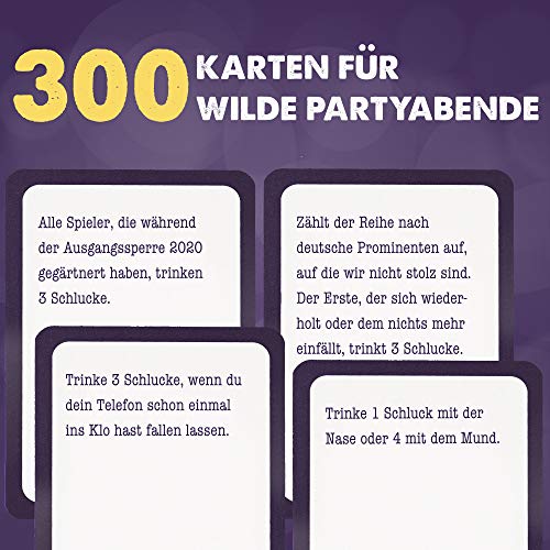 300 KARTEN FÜR EINEN UNVERGESSLICHEN PARTYABEND. ODER AUCH NICHT- "Komm schon. Nur ein Gläschen…" wir alle kennen diese legendären Partyabende, die mit diesem magischen/verfluchten Satz beginnen und am nächsten Morgen für böses Erwachen sorgen. Obwohl die Erinnerungen daran verschwommen sind, bleiben dies meist die legendärsten Feten! Mit der Trinkfalle sind solche Abende keine Seltenheit mehr.. UNKOMPLIZIERTE SPIELREGELN, SELBST IM TRUNKENEN ZUSTAND- Die Trinkfalle ist ein Partyspiel, das selbst der größte Vollpfosten unter deinen Freunden (du weißt genau von wem die Rede ist) versteht: Karte ziehen, lesen und Anweisungen ausführen. Sogar Karl-Heinz wird mit den Regeln dieses Trinkspiel ab 18 klarkommen.. 300 VERSCHIEDENE UND WITZIGE KARTEN - Unsere Mischung mit originellen Karten lässt euch die langweiligen Spiele vergessen, bei denen man Karten ohne Pep übereinander stapelt und versucht den Gästen ein gezwungenes Lächeln zu entlocken: Mit der “Trinkfalle”, dem Partyspiel für Erwachsene verbringt ihr einen witzigen Abend, bei dem ihr abstimmt, Handlungen ausführt, Schlücke trinkt und verteilt und bei jeder gespielten Karte aus dem Lachen nicht mehr herauskommen werdet.. DAS PERFEKTE GADGET BEI EINEM SPIELEABEND FÜR ERWACHSENE: SPIELE FÜR 2 PERSONEN BIS BELIEBIG VIELE SPIELER - Egal ob es für Spiele zu zweit oder in einer größeren Runde zum Einsatz kommt, die Trinkfalle ist eine garantierte Lachnummer auf höchstem Niveau.. VON 15 MIN BIS... ZUM NÄCHSTEN MORGEN - Dieses coole Kartenspiel kann für kurze Partien beim Vorglühen genutzt werden, aber auch für lange trinklastige Silvester Abende oder Geburtstags Partys. Oder für Gemeinschaftsspiele ohne Trinken. Entscheide selbst. Eins ist sicher… Unterhaltung ist garantiert.