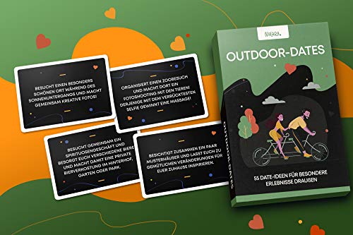 WAS DU BRAUCHST: Auf der Suche nach einer lustigen und originellen Möglichkeit deinem Partner näher zu kommen und wieder mehr miteinander zu erleben? Möchtest du ein tolles Weihnachtsgeschenk für diesen einen besonderen Menschen? "Outdoor Dates" ist die perfekte Lösung!. PERFEKT FÜR ALLE ANLÄSSE: Ob es sich um einen Geburtstag, den Valentinstag oder um Weihnachten handelt, "Outdoor Dates" ist die richtige Wahl als Geschenkidee! Sowohl als Partner Geschenke als auch als Hochzeitstag Geschenke für Männer!. DATE-KARTENSPIEL Genießt die Zweisamkeit mit diesem ereignisreichen Kartenspiel für Erwachsene, mit dem ihr euch gegenseitig auch besser kennen lernen könnt! Die mehr als 50 Date-Ideen werden euch tolle gemeinsame Erlebnisse verschaffen und eure Partnerschaft stärken (und zwar besser als es jeder Beziehungsratgeber je könnte)!. FÜR DEN LIEBLINGSMENSCH: Bestelle dieses erstaunliche Spiel für deinen Partner. Du kannst sicher sein, dass dieser Liebesbeweis super ankommt! Das Spiel ist extrem vielseitig und kann euch dabei helfen, euer ganz besonderes Ritual zu etablieren, bei dem ihr z. B. jeden Monat abwechselnd eine Date-Karte zieht.. DAS IDEALE GESCHENK: Ihr sucht romantische Weihnachtsgeschenke oder Geschenke für Frauen zu Nikolaus, Geschenkideen für deine Freundin, dass ihr zeigt: "Ich liebe dich", aber weißt nicht was du ihr schenken sollst? Mach ihr eine Freude - Schenke "Outdoor Dates"! Für alle, die langweilige Weihnachtsgeschenke für Frauen satt haben und lieber ausgefallene Geschenke bevorzugen.