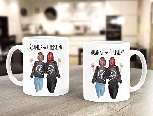 coole beste Freundinnen-Tasse mit vielen Anpassungsmöglichkeiten! Zeige deiner Lieblingsfreundin und Seelenverwandten, wie wichtig die Freundschaft für dich ist. Die perfekte Geschenkidee für Best Friends forever.. Individualisierte Geschenke sind etwas ganz Besonderes! Diese personalisierte Tasse gehört definitiv in die Kategorie "persönliche Geschenke". Denn was kann persönlicher, was individueller sein, als der eigene Name, ein selbst gestaltetes Bild oder die eigenen Worte?!. Einfach online Tasse selbst gestalten - Vorder und Rückseite sind jeweils individuell anpassbar. Wähle deinen Wunschtext und gestalte euer Freundinnenbild nach deinen Vorstellungen. Wähle Haarfarbe, Frisur, Kleidung und Accessoires aus und gebe zusätzlich deine Wunschnamen ein. Qualitäts-Keramik sowie hochwertige Herstellungsprozesse sorgen für hohe Langlebigkeit und langanhaltende Farbbrillanz. Spülmaschinengeeignet für eine leichte Reinigung. Klassische Form mit großem Henkel für einen sicheren Griff.. Unsere personalisierten Tassen werden in Deutschland mit Liebe zum Detail designed und in unserer kleinen Manufaktur sozial, fair und in liebevoller Handarbeit bedruckt. So entstehen ausgefallene, individuelle Geschenke und einzigartige Unikate!