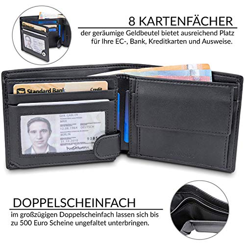 ???????????????????????????????????????????? - Die geräumige Geldbörse bietet 6 Kartenfächer & 2 Sichtfächer und ist mit 11,8 x 9,4 x 2,2 cm ausreichend groß für Karten, Geldscheine und Münzgeld. ???? ????????????????????????????Ä???????????????? + ???? ????Ü????????????????????????: Die Aufteilung des Herrenportemonnaies bietet genügend Stauraum. Zusätzlich gibt es ein Kleingeldfach mit Druckknopf.. ????Ü???? ????????????????Ü???????????? ???????????????????????????????????????? - Durch ein Institut geprüfte Abschirmung der RFID Frequenz 13,56 MHz. Ihre Karten mit NFC-Chip werden vor dem Auslesen geschützt. ????????????????????????????????????????????????: Das Portemonnaie kommt in edler Geschenkbox und eignet sich als Geschenk für Herren, Vater, Papa oder Freund zum Geburtstag, Ostern, Weihnachten.. ???????????????????????????????? ???????? ???????????????????????????? - Ausgewählte Materialien und deutsche Genauigkeit sorgen für Langlebigkeit und hochwertiges Design