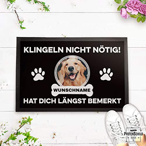 Sie lieben Ihren Hund und möchten das auch gleich Ihrem Besuch an der Wohnungstür übermitteln? Dann gestalten Sie Ihren eigenen Fußabtreter für die Eingangstür mit dem persönlichen HUNDEFOTO plus HUNDENAMEN Ihrer süßen Fellnase!. Die Gestaltung ist kinderleicht: Einfach auf ANPASSEN klicken und WUNSCHFOTO sowie den WUNSCHNAMEN Ihres Hundes angeben!. Die Türmatte besteht aus hochwertigem Velourmaterial mit schwarzem Gummirand und zeichnet sich durch einen erstklassigen Fotodruck in brillanten Farben aus - Maße: 60 x 40 cm. Durch die gummierte, schwarze Rückseite ist die Schmutzfangmatte besonders rutschfest - egal ob innen oder aussen. Für lange Freude am Produkt empfehlen wir, die Fußmatte per Hand zu waschen. Wenn Sie die Liebe zu Ihrem Haustier sichtbar machen wollen - dann ist eine Fußmatte mit dem passenden Tiermotiv oder einem süßen Spruch die perfekte Möglichkeit, um der Tierliebe Ausdruck zu verleihen.
