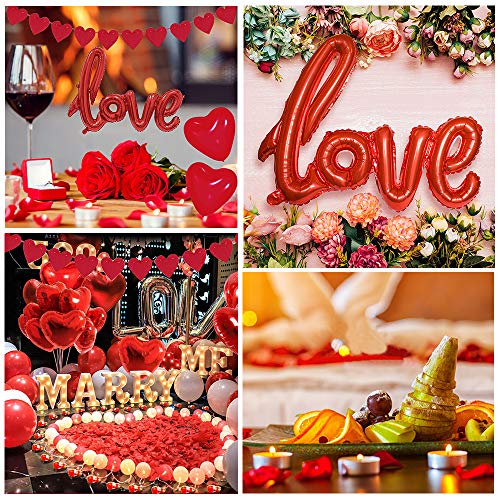 Valentinstag Dekoration Set,Romantische Kerzen Rote Teelichter und Rosenblätter Romantisch Deko Set mit Herzluftballons, Girlande,Love Ballon Hochzeit Set für Sie&Ihn - Freundin & Freund