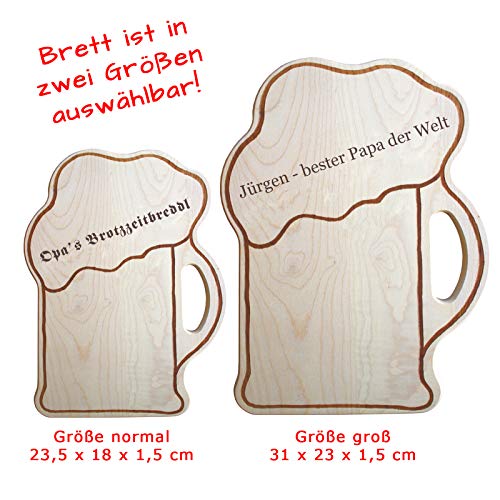 Individuell gestaltbar: Wir personalisieren die Holzbretter mit Namen oder Sprüchen, ein tolles persönliches Geschenk für Männer, Freund, Ehemann, Vater, Opa, Freunde … z.B. zum Geburtstag, Vatertag, Weihnachten, Ostern, Jubiläum, .... Außergewöhnliches Design: Das Maßkrug - Holzbrett ist auch als Dekoration beliebt - nicht nur bei Bier - Freunden! Zum Frühstück, Mittagessen oder Brotzeit ist es praktisch, danach aufgestellt in Küche oder Wohnbereich ein besonderes Dekostück.. Vielseitig einsetzbar: Das Brotzeitbrett gibt es in zwei Größen: normal 23,5x18x1,5cm ist ein ideales Frühstücksbrettchen und Brotzeitbrettchen. Groß 31x23x1,5cm als Schneidebrettchen XXL, Servierplatte oder Deko nutzbar.. Naturprodukt: Ohne Plastik oder sonstige Zusätze, gefertigt aus reinem Ahornholz. Holz ist seit Jahrhunderten ein bewehrter Helfer in der Küche und Gastronomie. Traditionell vielseitig, mit Gravur aus unserer Geschenke Werkstatt in Bayern.. Robust & langlebig: Die Bierkrug Brettchen machen lange Freude! Mit diesen hochwertigen Holzbrettern aus Ahorn haben Sie bei entsprechender Pflege jahrelange, treue Küchenbegleiter.