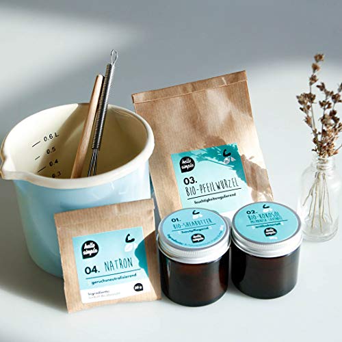 ? Stell dir zu Hause dein eigenes natürliches Deo her – super wirksam und ohne schädliche Stoffe! EIN DEO KOMMT SELTEN ALLEIN: Das DIY-Set ergibt 2 Tiegel Deocreme (je 75 g)! Damit hast du bei täglicher Anwendung einen Vorrat von mind. 7 Monaten, da die Deocreme sehr ergiebig ist. Oder du machst jemandem eine Freude und verschenkst den zweiten Tiegel einfach. Im Set: exakt portionierte Bio-Zutaten für 2 Gläser Deocreme, Rezeptkarte, 2 Tiegel & Etiketten.. ? Wir verwenden ausschließlich reine, unraffinierte Bio-Zutaten – so bleiben alle pflegenden Inhaltsstoffe und der natürliche Geruch erhalten.. ? 3 Duftrichtungen - Limette-Zypresse: frisch-herb; desodorierende Wirkung. Palmarosa-Lavendel: dezent blumig; desodorierende Wirkung. Natural: perfekt für Minimalismus-Liebhaber; sowie für Duftstoffallergiker und Schwangere geeignet.. ? Anwendung: Die Achseln mit ca. einer erbsengroßen Menge einreiben, um den ganzen Tag vor unangenehmen Gerüchen geschützt zu sein. Stimmt wirklich! Nicht umsonst hat es schon den Namen „Wunderzeug“ erhalten.. ? Sogar der Versand ist grün: hello simple nutzt DHL GoGreen: Mit diesem Umweltprogramm gleicht das Logistikunternehmen die durch den Transport entstehenden Treibhausgase durch Klimaschutzprojekte aus.