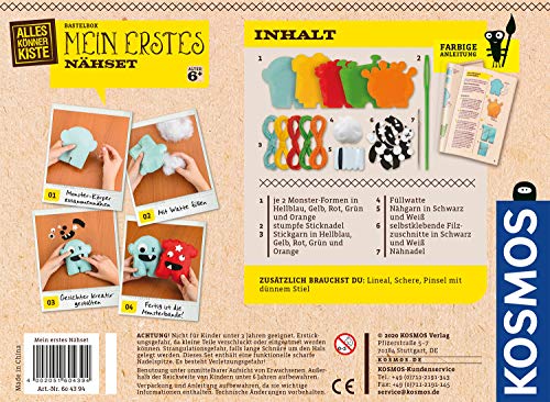 Einzigartiges DIY-Projekt für Kinder ab 6 Jahren: vom Entwurf bis zum fertigen Monster. Ausführliche Schritt-für-Schritt Anleitung: Witzige Monster-Illustrationen führen durch die liebevoll gestaltete Anleitung. Für Einsteiger geeignet: Vorgestanzte Monsterformen, selbstklebende Verzierungen aus Filz und die supersichere, stumpfe Nadel sind für jüngere Kinder besonders leicht zu handhaben. Erfolgserlebnis garantiert. Freude am Lernen: Die AllesKönnerKiste „Mein erstes Nähset“ fördert Konzentration, die Feinmotorik und Kreativität. Hochwertiges Material: 10 vorgestanzte Monster-Formen aus Filz, 30 selbstklebende Filz-Verzierungen, 3 Bündel Stickgarn, stumpfe Nadel, Füllwatte, Anleitung. Das Ideale Geschenk-Set: Die AllesKönnerKisten enthalten alle Materialien, um sofort loszulegen. Ein ideales Geschenk zum Kindergeburtstag, Einschulung oder Weihnachten und Ideal geeignet für gemeinsame Bastelnachmittage