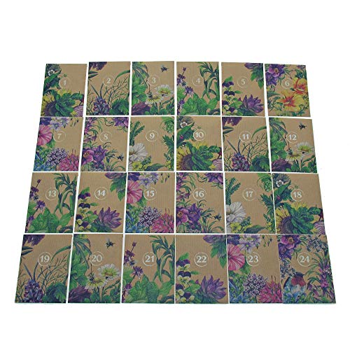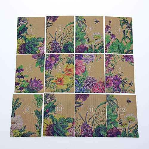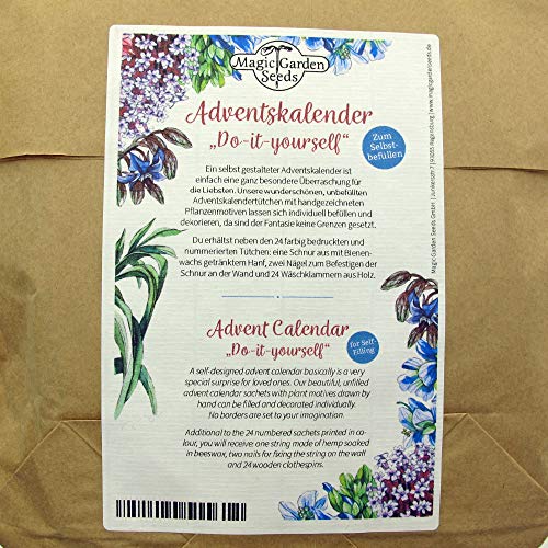Dieses 'Do-it-yourself' - Adventskalenderset besteht aus 24 farbig bedruckten und durchnummerierten Papiertütchen aus braunem Packpapier. Bestens geeignet für einen selbstgebastelten individuellen Adventskalender.. 24 kleine Wäscheklammern aus Holz, eine Schnur aus Hanf und 2 Nägel sollen die Befestigung der Tütchen erleichtern.. Wir benutzen diese Tütchen, um sie mit wunderbaren Pflanzensamen zu bestücken, aber natürlich kann man sie sehr kreativ und vielfältig mit anderen schönen Überraschungen befüllen.. Die Papiertütchen haben die äußeren Maße: 13 x 9,5cm (Länge x Breite) plus 1,5cm in der Länge für die Lasche zum Verschließen der Tüte.. Insgesamt zehn verschiedene Blumenillustrationen. Acht davon wiederholen sich mehrfach und zwei kommen nur einmalig vor für den 6. und 24. Dezember (Nikolaustag und Heiligabend).