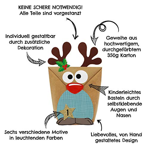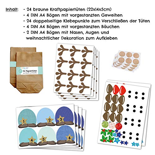 DER BESONDERE ADVENTSKALENDER: Hier erhälst du einen kreativen Weihnachtskalender zum Befüllen - 24 niedliche Rentiere versüßen dir dieses Jahr das Warten auf Weihnachten - Rentier blau - zum selbst basteln. KOMPLETTSET: In diesem DIY (Do it yourself) Adventskalender für Kinder ist alles enthalten, was du zur Gestaltung deines ganz persönlichen Adventskalenders benötigst, nur einen Klebestift musst du selbst mitbringen. INDIVIDUELL: Mit den zusätzlichen Stickerbögen gestaltest du die Tüten ganz nach deinen Wünschen. Wenn du Freude am Basteln hast ist dies genau das Richtige für dich. VORGESTANZT: Alle Geweihe und Bäuche sind bereits vorgestanzt und können kinderleicht aus der Form herausgetrennt werden, du benötigst zum Basteln keine Schere oder sonstige Utensilien. Die stabilen Bodenbeutel (Größe 22x14x5cm) eignen sich ideal für Süßigkeiten, Spielzeugautos, Pixie-Bücher, Murmeln, Knete und weitere tolle Kleinigkeiten. HERGESTELLT IN DEUTSCHLAND: Dieser Artikel wird in Deutschland mit Hilfe einer Werkstatt für Menschen mit Behinderung hergestellt. Unsere hohen Qualitätsansprüche garantieren noch mehr Freude beim Basteln