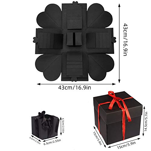 ? ? Dieses handgemachte Sammelalbum enthält ein Cover und eine Schachtel. Von außen ist es ein schwarzer Würfel. Wenn die Box geöffnet wird, wird ein selbst entworfenes 3D-DIY-Sammelalbum geöffnet.. ? ? Wir haben eine sehr praktische Idee für diese Geschenkbox entworfen. Hier können Sie Ihre Kreativität frei zeigen und alle Fotos und Dinge, die Sie benötigen, selbst basteln. Kreieren Sie einzigartige Geschenke für alle Gelegenheiten, egal ob Geburtstag, Weihnachten, Valentinstag, Ostern, Jubiläum, Muttertag oder Hochzeit.. ? ? Die Explosionsbox besteht aus hochwertigem Karton, ist stark und langlebig und lässt sich nicht leicht verformen und biegen. Kann lange gelagert werden. Darüber hinaus enthält die Creative-Box vier verschiedene Ebenen, die Sie frei gestalten können. Das 3D-Fotoalbum enthält eine kleine Geschenkbox, mit der Sie Geschenke verstecken und weitere Überraschungen erleben können.. ? ? Wenn das Album geschlossen ist, beträgt die Größe des oberen Covers 15,4 * 15,4 cm und die Größe der unteren Plusbox 15 * 15 * 15 cm. Diese Explosionsbox wird mit viel Zubehör geliefert. 1 x kleine Geschenkbox+10 x Metallfarbstift+8 x Überraschungskarten+6 x Aufkleber+2 x Fotoecke+2 x kleine trockene Blüten+1 x doppelseitiges Klebeband+1 xSpitzenband +1 xRot Band + 1 xSchwarz Band.. ? ? Dies ist eine sehr coole Geschenkidee. Sie können Ihre wertvollsten Erinnerungen mit Ihrer Familie und Freunden speichern! Wenn Sie ein Geschenk mit Ihrem Herzen machen und es Ihren Freunden, Ihrer Familie oder Ihren Liebhabern geben, werden sie auf jeden Fall sehr glücklich sein!