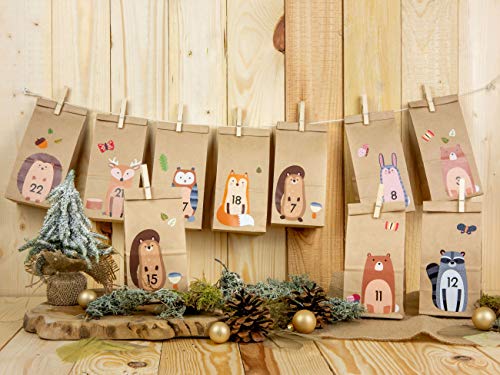 DER BESONDERE ADVENTSKALENDER: Du erhälst hier einen DIY Adventskalender zum selber basteln - Motivkalender Waldtiere braun zum Befüllen - damit bringst du garantiert die Augen des Beschenkten zum Strahlen. INDIVIDUELL BEFÜLLEN: Die standfesten Bodenbeutel kannst du mit kleinen Leckereien und Spielzeug befüllen und so für schöne Überraschungen in der Weihnachtszeit sorgen. Dekoriert mit den süßen Waldtierchen kreierst du einen wundervollen individuellen Weihnachtskalender. KINDERLEICHT: Bastel deinen ganz persönlichen Adventskalender und schmücke ihn mit diesen süßen Motiven. Damit wird jeder Adventskalender ein Hingucker. Durch die Sticker benötigst du keine Schere oder Klebestift. WIEDERVERWENDBAR: Mit den enthaltenen Holzklammern kannst du die Tüten immer wieder Verschließen und gleichzeitig sogar an einer Schnur aufhängen. So erschaffst du eine tolle Dekoration in der Vorweihnachtszeit. HERGESTELLT IN DEUTSCHLAND: Dieser Artikel wird in Deutschland mit Hilfe einer Werkstatt für Menschen mit Behinderung hergestellt. Die hochwertigen und ausgewählten Materialien garantieren noch mehr Freude beim Basteln