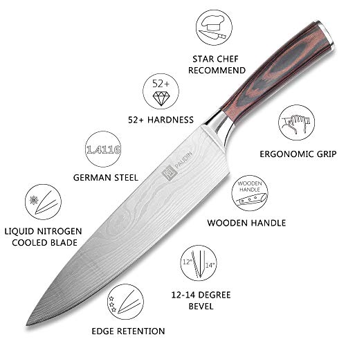 ULTRASCHARFE KLINGE: Ultra Scharfe Klinge ist aus hochwertigem deutschem Edelstahl mit 16-18% Chrom und 0,6-0,75% Kohlenstoff. Die Klinge ist definitiv rostbeständig. Dies gibt dem Kochmesser eine glänzende und glatte Oberfläche, ideal um Fleisch oder Obst und Gemüse mühelos zu schneiden.. HOCHWERTIGE MATERIALIEN: Das professionelle Küchenmesser mit 20cm Klinge ist aus rostfreiem deutschem Edelstahl mit hohem Kohlenstoff hergestellt. (Hochwertiger Spezialedelstahl 5cr15mov, KEIN Damastmesser) Es ist mit der Rockwell-Härte von 56-58, welcher sich durch hoher Qualität auszeichnet, ist schnitthaltig, langlebig und schmutzabweisend.. ERGONOMISCHER GRIFF: Der Griff des Messers ist für seine Handhabung, Komfort, Stärke und Stabilität bekannt. Durch den ergonomisch geformten und rutschfesten Griff aus elegantem Holz mit integriertem Fingerschutz arbeiten Sie immer sicher und schnell. Optimal geeignet für unterschiedlichen Hände.. MULTIFUNKTIONALES CHEFMESSER: Das elegante Küchenmesser für Profis und Hobbyköche ist optimal geeignet zum Schälen, Schneiden und Zubereiten von Obst, Gemüse, Fleisch, Fisch und Kräutern. Entworfen für vielfältige Zwecke und professionelle Anwendungsbereiche, es ist wirklich ein Allzweckmesser.. LEBENSLANGE GARANTIE: Wir bieten Ihnen eine 100% Zufriedenheitsgarantie. Wenn Sie Problem haben, so kontaktieren Sie uns bitte und wir werden Ihnen den Kauf erstatten oder ersetzen! Lebenslange Garantie auf Material- und/oder Verarbeitungsmängel. Kaufen ohne Risiko.