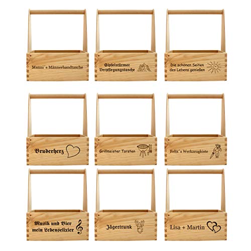 Personalisierte Geschenke für Männer: Sie geben einen Namen oder Spruch ein, so wird aus einem normalen Flaschenträger ein einzigartiger Holzbierträger, ein personalisierter Flaschenkorb - das perfekte Männergeschenk!. Flaschenträger aus Holz: Praktisches Utensil für gesellige Abende. Der Getränketräger sorgt für Erfrischung. Für 6 Bierflaschen mit 0,33 Liter oder 0,5 Liter (Flaschen Ø maximal 7 cm). Perfect Sixpack for Beer to Go!. Multi Getränketräger: Sechs Fächer - Fächer sind herausnehmbar! - stehen auch für sechs Geschmäcker. Nicht nur Bier macht sich gut in der Flaschenkiste. Schnaps, Wein, Saft oder Wasser findet darin Platz. Oder gibt es einen Bier-Contest?. Naturprodukt: Der Bierträger ist aus Kiefernholz hergestellt. Die Holz Bierkiste ist rustikal und langlebig. Neben der langen Haltbarkeit ist der Bierflaschenträger nachhaltiger als Kunststoff und umweltfreundlicher.. Männergeschenke: Ideale Geschenkidee für Männer zum Geburtstag, Vatertag, Grillen, Fußball, Camping oder einfach zwischendurch. Eine schicke, individuell anpassbare Männerhandtasche Bier passt zu jedem Anlass als Präsent.
