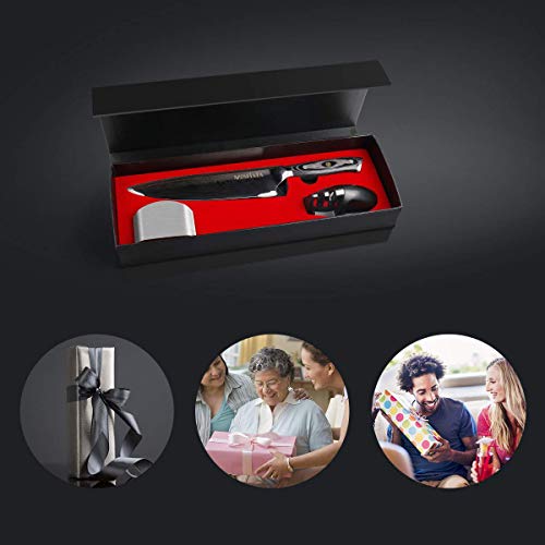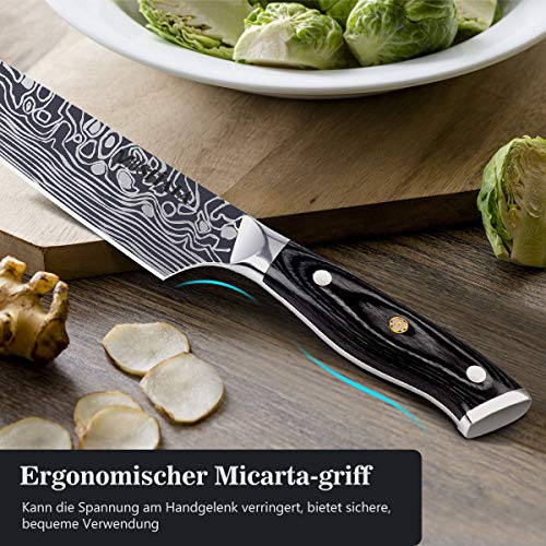 ?Hochwertige Edelstahlklinge?Das professionelle Küchenmesser aus hochwertigem Karbon Edelstahl und enthält 0,6-0,75% Kohlenstoff, 16-18% Chrom, 56-58 Rockwell-Härte, Es hat hoher Korrosionsbeständigkeit,hoher Härte,Verschleißfestigkeit. Nach langer Gebrauch beschlagen oder verblassen Kochmesser nicht.. ?Vielseitges Küchenmesser& Schnelles Schneiden?Der Schneidewinkel des Küchenmesser beträgt 16 Grad, die optimale Schärfe bieten. damit können Kochmesser alles Lebensmitteln, Egal ob Tomaten, Lauch, Fleisch oder Salat, dieses Fleischmesser schneidet ganz geschmeidig ohne Mühe bei nur einem Schnitt. Außerdem kann Kochmesser auch Fleisch von Knochen trennen.. ?Ergonomisches Holzgriff ?Der Griff des Küchenmesser wird aus Pakka hergestellt und die als Komfort, Stärke und Stabilität bekannt ist. Es sorgt für angenehmen Halt, minimiert Ermüdungserscheinungen der Finger und verbessert die Balance.Kochmesser werden Ihnen ein komfortables und bequemes Gefühl beim Gebrauch geben.. ?Perfektes Geschenk?Küchenmesser mit dem Fingerschutz, Messerschärfer wird alle Küchenaufgaben gut fertig gemacht. Dank der Geschenkbox eignen sich diese Allzweckmesser perfekt als Hochzeits- oder Geburtstagsgeschenk zum Ihren Familien und Freunden. Wer gerne kocht und täglich frisches Essen zubereitet, muss sich so dieses Kochmesser besorgen.. ?Lebenslange Garantie? Wir streben nach 100% Zufriedenheit und Perfektion für jeden Kunden. Lebenslange Garantie gegen Material- und Verarbeitungsfehler. Falls Sie Orient nicht lieben, bieten wir eine Geld-zurück-Garantie. Ein ideales Geschenk für jeden Nahrungsmittelliebhaber, Hauptkoch, Prochef, Commis Chef, kulinarischer Kursteilnehmer.