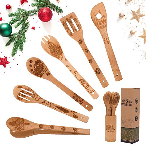 ?PERFEKTES GESCHENK ODER DEKORATIONEN? Unser einzigartiges Weihnachtsküchen-Kochgeschirr ist das perfekte und erschwinglichste Geschenk. Sie können dieses Küchenset als Geschenk für Ihre Freunde und Familie, Einweihungsgeschenke, Neujahrsgeschenke, Geburtstagsgeschenke, Weihnachtsgeschenke und Halloween verwenden Geschenke, Hochzeitsgeschenke. Für diejenigen, die gerne kochen, einfache und praktische Werkzeuge oder Geschenke!. ?EINFACH ZU REINIGEN UND ZU LAGERN? Hohe Temperaturbeständigkeit, kein Rost, keine Verzerrung oder Farbveränderung, leichte Qualität und gutes Gefühl, kratzen und beschädigen die empfindlichen Küchenutensilien in Ihrer Küche nicht. Bambus-Kochgeschirr ist antihaftbeschichtet, leicht zu reinigen und zu lagern. Sie können Holzkochgeschirr leicht von Hand mit einem neutralen Reinigungsmittel reinigen und auf natürliche Weise trocknen lassen.. ?Mehrzweck? Halloween-Holzlöffel können Ihrem Zuhause und Ihrer Küche eine einzigartige natürliche Atmosphäre verleihen. Sie können diese Utensilien zum Braten, Backen, Mischen, Umdrehen bei hoher Hitze verwenden und passen fast zu allen Kochanwendungen in Ihrem Haus und Ihrer Küche.. ?HOCHWERTIG? Bambusutensilien sind dick, stark und robust, damit sie auch bei herzhaften Mahlzeiten nicht aus Ihren Händen rutschen. Das geringe Gewicht und die überlegene Stärke unseres Bambus bedeuten, dass Sie Ihre Rezepte nicht mit billigen, fadenscheinigen Kochalternativen kompromittieren. ?PRAKTISCHES DESIGN? Unser robustes Bambuslöffelset besteht aus hochwertigem Naturbambus, der sich nicht leicht verformen lässt und sehr hitzebeständig ist. Im Set enthalten Massiver Löffel, Utensilienhalter, flacher Löffel, geschlitzter Löffel, Gabellöffel, gebogener Mischspatel , Spatel, Set Löffelzangen erfüllen Ihre Kochbedürfnisse. Unser Bambuslöffelset ist Ihr zuverlässiger Partner in der Küche.