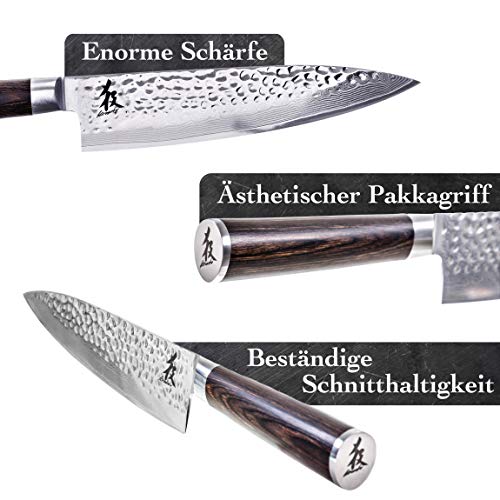 ?EXTREM SCHARF - Das Damaszener Messer wurde aus insgesamt 67 verschieden Schichten AUS-10 Super Stahl geschmiedet. Dieser Damast Stahl kann viel intensiver geschliffen werden als bei herkömmliche Messern.. ?LANGANHALTENDE SCHÄRFE - Da der Damaststahl der Klinge einen besonders hohen Härtegrad von 61 (+/- 1) hrc hat bleibt das handgeschmiedete Kochmesser wesentlich länger scharf als bei herkömmliche Profimesser.. ?QUALITATIV ÜBERLEGEN - Wir legen besonders viel Wert auf die Verarbeitung unserer Kochmesser, deshalb verwenden wir extrem hochwertige Materialien. Außerdem durchläuft unser Damaskus Küchenmesser strenge Qualitätskontrollen.. ?LIEGT ANGENEHM IN DER HAND - Der speziell für dieses Profi Messer angefertigte Pakka Holzgriff sorgt für eine exzellente balance zwischen Griff und Premium-Klinge - Dies ist die perfekte Voraussetzung für ein angenehmes Schnittgefühl.. ?DU BIST 100% ZUFRIEDEN ODER GELD ZURÜCK - Falls du mit unserem Produkt nicht 100% zufrieden bist, schick es ganz einfach zurück und wir erstatten dir den vollen Betrag - ohne Wenn & Aber!