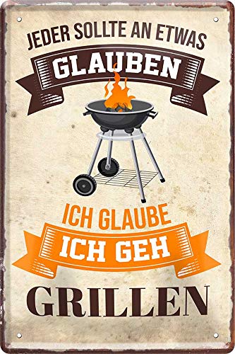 LUSTIGER Spruch: "Jeder sollte an etwas Glauben... Grillen". Gewölbtes Blech und abgerundete Ecken machen dieses Wand Blechschild zum absoluten Hingucker. Ideal für: Garten, Terrasse, Küche, beim Grillen... SUPER PRAKTISCH: Das Blech-Schild im beliebten 20 x 30 cm Format mit vorgebohrten Löchern - kann kinderleicht überall angebracht werden.. ORIGINAL Blechschild vom Schilder-Kreis. Unsere hochwertigen Schilder im Vintage / Retro Stil stehen für Qualität und Langlebigkeit. Alle Artikel werden NEU & in Original Verpackung versendet.. DEKORATIVES WOHN-ACCESSOIRE für viele Bereiche - zum Beispiel als Deko für Theke oder Bar, Cafe, Hotel, Club, Küche, Wand, Partykeller, Werkstatt, Poster-alternative, Plakat Ersatz, Hauseingang, Irish Pub, Wohnzimmer, Keller, Garten Tor, Hobbyraum, Garage, Esszimmer, Wohn & Schlafräume. HAMMER GESCHENKIDEE für jeden Anlass: Weihnachten, Geburtstag, Vatertag, Namenstag, Muttertag, Feiertag, als besondere Überraschung, als Einladung für eine Party oder Feier, Mädelsabend, Junggesellenabschied / Junggesellinnenabschied (JGA), als Hochzeitsgeschenk, für Sammler, zum Einzug ins neue Zuhause, für die erste Wohnung, Mitbringsel für Grill Feier, zum Wichteln oder einfach um sich selbst eine kleine Freude zu machen. :)