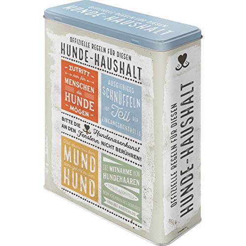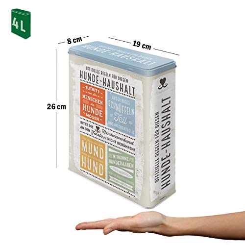 HUNDE GESCHENK: für Hunde-Liebhaber, besonders hochwertiger, mattschimmernder und farbenfroher Druck in 1A Qualität. WE LOVE RETRO: Vorratsdose im nostalgischen Design mit Mattlack-Finish und rundum geprägtem Motiv. PRAKTISCH UND ROBUST: lebensmittelechte Metall-Dose mit 4 l Fassungsvermögen, ideal als Dose für Trockenfutter oder als Müslidose und Plätzchendose geeignet und zur Aufbewahrung von Cornflakes, Küchenutensilien, Keksen, Nudeln und vielem mehr. COOLER HINGUCKER UND TOLLES GESCHENK: Aufbewahrungsbox im Format 8 x 19 x 26 cm, mit vollständig abnehmbarem und fest schließendem Deckel. OFFIZIELLER LIZENZPARTNER: lizenziertes Originalprodukt "Designed in Berlin"