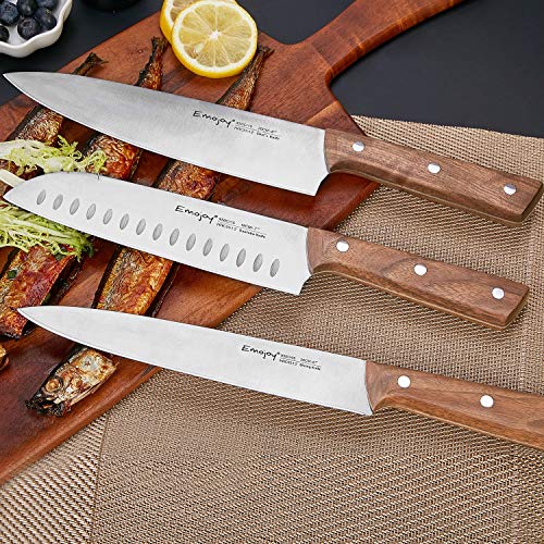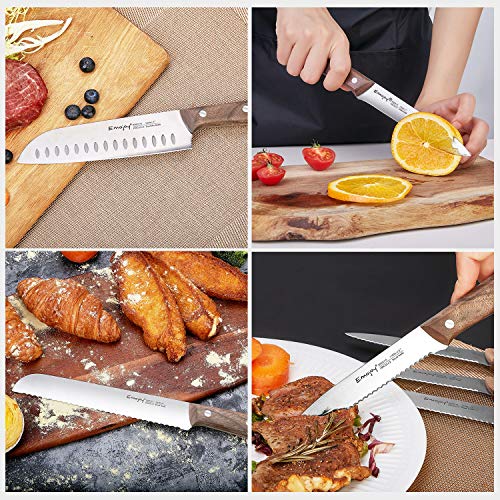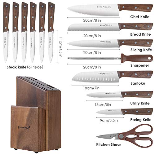?HOCHWERTIGES MESSERSET? Der traditionelle dreifach genietete Griff mit vollem Zapfen bietet maximalen Komfort und Stabilität beim Schneiden. Moderner Stil, ergonomische Griffe, die eine perfekte Balance zwischen Klinge und Griff bieten, bieten einen bequemen Griff und zusätzliche Haltbarkeit.. ?ULTRA-HARTES, SCHARFES MESSERSATZ? Jedes Messer ist aus einem einzigen Stück stabilem Kohlenstoffstahl präzisionsgeschmiedet, der Flecken und Korrosion widersteht. Ultraharte, scharfe Klinge, die korrosionsbeständig und hochelastisch ist. Die Klingenkante ist auf jedem geschliffen Seite, die eine gerade scharfe Kante erzeugt.. ?NÜTZLICHE MESSERSÄTZE FÜR DIE KÜCHE? Das 15-teilige professionelle Messerset enthält ein 8-Zoll-Kochmesser, ein 8-Zoll-Schneidemesser, ein 7-Zoll-Santoku-Messer, ein 8-Zoll-Brotmesser, ein 5-Zoll-Universalmesser, ein 3,5-Zoll-Gemüsemesser, eine Küchenschere, einen Messerschärfer, 6 Stück 4,5-Zoll-Steakmesser und ein Hartholzblock mit 14 Schlitzen. Das natürliche Holzmaterial macht jedes Messer einzigartig und sogar der Griff jedes Messers hat seine eigene exklusive Farbe.. ?EINFACHE PFLEGE? Da die meisten Geschirrspüler extrem abrasiv sind, empfehlen wir immer, sie sofort mit warmem Wasser und einem milden Reinigungsmittel zu waschen, abzuspülen und trocken zu wischen. Die Schneide durch regelmäßiges Verwenden eines Honstahls pflegen und Verletzungen vermeiden.. ?100% ZUFRIEDENHEIT? Wir sind bestrebt, Ihr Kocherlebnis zu verbessern. Es liegt in unserer Verantwortung, die Qualität der Produkte zu gewährleisten. Nehmen Sie einfach Kontakt mit uns auf, wenn Sie Probleme mit dem Emojoy-Messerset haben.