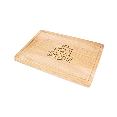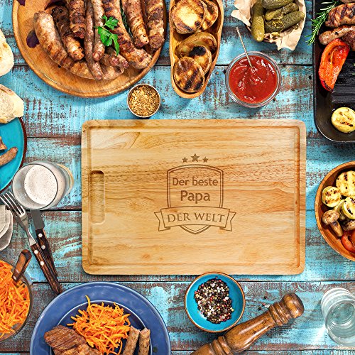 VIELSEITIGES SCHNEIDEBRETT: Das Tranchierbrett aus stabilem Ahornholz hält den täglichen Belastungen beim Zubereiten von Speisen und beim Kochen stand und macht sich als Brotzeitbrett oder Frühstücksbrett ebenso gut.. GRAVIERTES KOMPLIMENT: Auf das Schneidebrett wird groß der Spruch „Der beste Papa der Welt“ graviert. So zaubern Sie Ihrem Vater schon am Frühstückstisch ein Lächeln auf das Gesicht.. GECHENKIDEE ZUM VATERTAG: Dank der tollen Gravur eignet sich das Schneidebrett perfekt als Geschenk für Papa oder Opa zum Geburtstag, zu Weihnachten, zum Vatertag oder zum Herrentag.. QUALITÄTSPRODUKT: Bei dem Schneidebrettchen handelt es sich um ein aus hochwertigen Materialien gefertigtes Markenprodukt aus dem Hause Crazy Kitchen, hergestellt und individuell für Sie graviert in Deutschland.. MAßE: Die Maße betragen 40 cm x 28 cm, das Brettchen ist 2 cm dick und wiegt ca. 2.000 g. Vor der ersten Benutzung und danach in regelmäßigen Abständen sollte das Schneidebrett mit Holzöl behandelt werden.