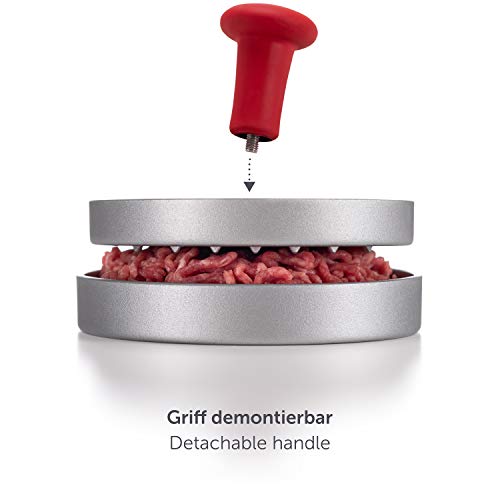 ?HOCHWERTIGES GRILL ZUBEHÖR FÜR MÄNNER: Die Aluguss Hamburgerpresse hat eine Antihaftbeschichtung. Das Herauslösen der Burger Patties ist ein Kinderspiel und gelingt im Handumdrehen.. ?OPTIMALE PATTY GRÖSSE: 11cm Innen- und 12cm Außen- Durchmesser sorgen für die perfekten Hamburger Pattys. Passe die Füllmenge beim Grillen an und entscheide wie dick sie sein sollen.. ?50 STÜCK BACK-PAPIER INKLUSIVE: Inbegriffen sind 50 runde Backpapier-Zuschnitte für eine haftfreie Herstellung. Außerdem kannst Du die Burger Buns so ablegen, ohne festzukleben.. ?LEICHT ZU VERSTAUEN: Der rote Griff zur Druckverteilung setzt nicht nur Akzente und sieht gut aus, er ist zudem leicht abzunehmen und ermöglicht ein einfaches Verstauen in der Kartonbox.. ?WERDE ZUM BURGERMEISTER: Der perfekte Burger gelingt nicht auf gut Glück. Jeder Schritt muss sitzen. Um Deine Burger Patties musst Du Dir nun keine Sorgen mehr machen.