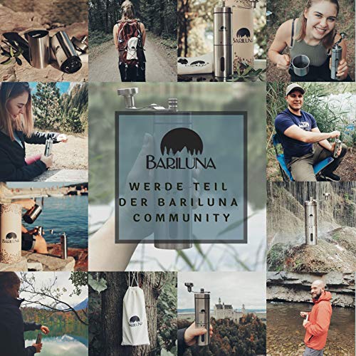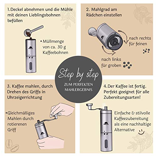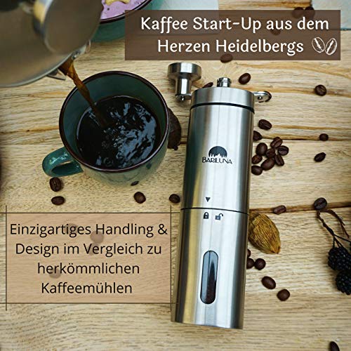 ?BARILUNA VERSPRICHT - höchste Qualität und feinsten Kaffeegenuss für Zuhause und unterwegs. Unsere Mühle hat ein Fassungsvermögen von ca. 30 g Kaffeepulver - das entspricht ca. 800 ml, bzw. 4 Tassen frischen Kaffee zum Genießen.. ?MODERN UND ZEITLOS - Unsere Kaffeemühle zeichnet sich durch ihr einzigartiges Handling im Vergleich zu herkömmlichen Mühlen aus. Der Pulverbehälter lässt sich durch einen Bajonettverschluss verriegeln und ermöglicht einfaches Mahlen.. ?MAHLGRADEINSTELLUNG - Die stufenlose Mahlgradeinstellung des Bariluna Coffee Grinder sorgt für gleichmäßiges Mahlgut von fein (Espresso) bis grob (French Press). Das Mahlwerk erzeugt keine Hitze & der Kaffee behält sein volles Aroma.. ?PRAKTISCHE EXTRAS - Unsere Mühle kommt mit einem Löffel, Pinsel, Baumwollbeutel & E-Book. Mit dem Pinsel lässt sich das Mahlwerk reinigen & der Löffel erleichtert die Dosierung. Der Beutel ermöglicht einen sicheren , kratzfreien Transport.. ?DER UMWELT ZU LIEBE - Genieße deinen Kaffee frei von Batterien & elektrischem Schnick Schnack. Gefertigt aus gebürsteten, rostfreien Edelstahl sticht unsere Mühle aufgrund ihres Designs & ihrer Qualität hervor - Gib der Natur etwas zurück!