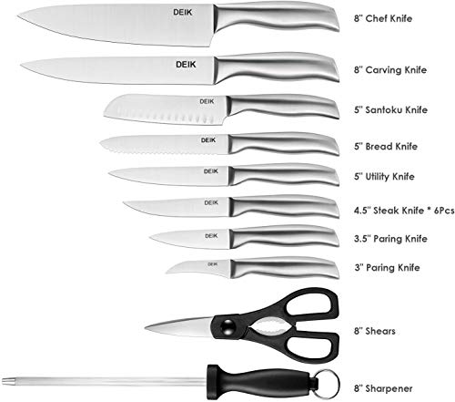 Scharfe Klinge aus Deutschem rostfreiem Spezialstahl und Messerblock aus Eichenholz. Dadurch haben diese Messer eine längere Lebensdauer und bessere Korrosionsbeständigkeit. 16-teiliges Messerset?Holzblock, 8 "Chef Messer, 8" Fleischmesser, 8 "Rostfreier Schärfstahl, 8" Schere, 5 "Mehrzweckmesser, 5" Santoku Messer, 5 "Tomaten Messer, 4,5" Steak Messer * 6 Stücke, 3,5 "Schälmesser, 3" Schälmesser. Anders als herkömmliche Messer aus einem Stück durchgehend geschmiedet. Geringes Gewicht für ermüdungsfreies Arbeiten. Die Messer sind nach mechanischen Prinzipien perfekt austariert.. Antibakterielle Technologie: Schmutz kann sich nicht festsetzen, Bakterien haben keine Chance. Sauberes Design nach aktuellen wissenschaftlichen Erkenntnissen.. QUALITÄTSGARANTIE: 100% Neuware mit bedingungsloser 30-Tage-Geld-zurück-Garantie sowie 2 Jahren Garantie