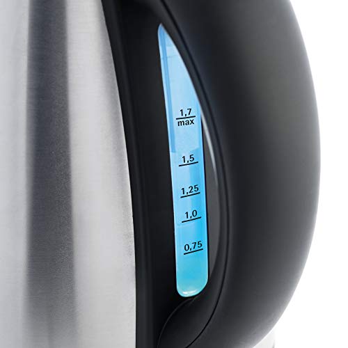 Inhalt: 1x Edelstahl Wasserkocher mit Kalkfilter (16 x 22,5 x 25 cm, Volumen min. 0,5 - 1,7 liter, 2400 W, Kabellänge 0,75m) - Artikelnummer: 0413020012. Der Heizvorgang kann jederzeit abgebrochen werden indem man den Wasserkocher vom Sockel nimmt. Während dem Aufheizen leuchtet die Wasserstandanzeige blau. Hohe Sicherheit durch Trockenlauf- und Überhitzungsschutz, Kochstoppautomatik und Deckelverriegelung. GS geprüft. Gummierter, rutschfester Griff für maximalen Komfort und Sicherheit. Der Wasserkocher-Behälter besteht innen wie außen komplett aus Edelstahl. Kabelloser Wasserkocher mit separatem Gerätesockel inkl. Kabelaufwicklung. Herausnehmbarer, abwaschbarer Kalk-Wasserfilter