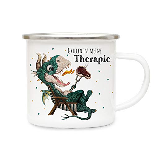 ilka parey wandtattoo-welt Emaille Becher Camping Tasse Kleiner Drache im Liegestuhl & Spruch Grillen ist Meine Therapie Kaffeetasse Geschenk eb421