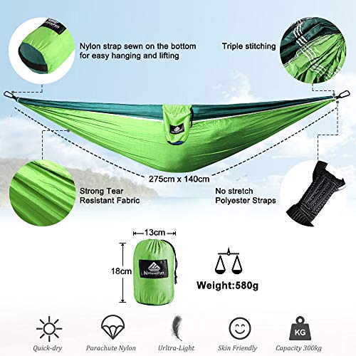 STÄRKE UND BAUMSCHUTZ - Hergestellt aus 210T-Fallschirmnylon in Militärqualität mit Dreifachnadel-Nähten und speziell entwickelten, ultra-starken Nylonbändern. Seine Bruchfestigkeit ist doppelt so hoch wie die der meisten Konkurrenten und es reicht aus, um über 3 durchschnittliche Erwachsene zu fassen! Es hat auch eine große Größe (275 x 140 cm). Die breiten Riemen machen es stabiler und fester, rutschen nie auf den Boden und schützen den Baum vor Beschädigungen.. SUPER LEICHT & KOMPAKT - Die Aufbewahrungstasche ist bequem direkt in die Hängematte eingenäht, damit Sie sie nie verlieren. Packt bis zu einer Größe von 18 * 13 cm, wiegt nur 520 g (enthält 2 haltbare Eisenkarabiner und 2 Nylonbänder). Es ist ultraleicht, klein und perfekt für Camping, Rucksackreisen, Reisen und allgemeine Erkundungen. Es ist auch toll in Ihrem eigenen Garten!. EINFACHE EINRICHTUNG - Diese tragbare Hängematte definiert Camping neu. Anstatt eine schwere Matte und einen Schlafsack zu tragen, stecken Sie die Hängematte einfach in den kleinen angehängten Beutel, legen Sie ihn in Ihre Tasche und verlassen Sie ihn. Die geschlungenen Gurte (2 * 2 Meter lange Gurte) machen alles einfacher, Sie müssen nie wieder einen Knoten machen, Sie können die Hängematte innerhalb von 1 Minute aufstellen.. AMTLICHE ZERTIFIZIERUNG - Die Naturefun-Hängematten wurden vom TÜV auf Belastbarkeit von über 300 kg getestet. Sie sind atmungsaktiv, schnell trocknend und mit Ripstop-Technologie ausgestattet und bieten ein langlebiges und komfortables Bett / Schaukel für Erwachsene und Kinder. Sie sind auch ein großartiges Geschenk Für alle, die die Natur lieben. In Chihee finden Sie eine größere Hängematte, professionelle Hängebaumgurte und eine Regenplane für Ihre Outdoor-Aktivitäten.. LEBENSLANGE GARANTIE - Als professionelle Outdoor-Marke hat NatureFun viel Nachdenken und Sorgfalt in das Design und die Funktionalität unserer Produkte gesteckt, um sicherzustellen, dass sie von höchster Qualität sind. Wir haben eine 100% Geld-zurück-Garantie. Wenn Sie aus irgendeinem Grund mit Ihrem Kauf nicht 100% zufrieden sind, kontaktieren Sie uns einfach und wir erstatten Ihnen den Kaufpreis oder ersetzen ihn, ohne dass Fragen gestellt werden.