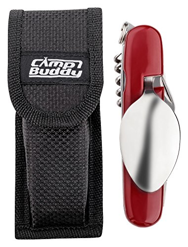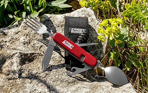 ESSBESTECK IM PAAR: Das Klappbesteck kann einzeln genutzt oder leicht in zwei Teile mit unterschiedlichen integrierten Funktionen auseinandergenommen werden.. ALLES, WAS MAN ZUM ESSEN BRAUCHT: Gabel, Korkenzieher und Flaschenöffner im einen Teil, Messer und Löffel im anderen – alle Tools können je nach Bedarf aus- und eingeklappt werden.. BESONDERS HANDLICH: Geschlossen ist das 160g leichte Besteckset nur 115mm lang, um einen leichten Transport zu gewährleisten. Einseitig geöffnet ist es bis zu 190mm lang, um problemlos damit essen zu können.. ROBUST UND HYGIENISCH: Das zweiteilige Camping Multitool ist aus hochwertigem Edelstahl gefertigt. Das garantiert nicht nur große Robustheit und Langlebigkeit, sondern macht es auch leicht abwaschbar.. NYLONTASCHE IM LIEFERUMFANG: Zum einfachen Transport eignet sich die mitgelieferte Nylon Tasche. Dadurch kann das Wanderbesteck problemlos im Rucksack gesichert und vor Verschmutzung bewahrt werden.