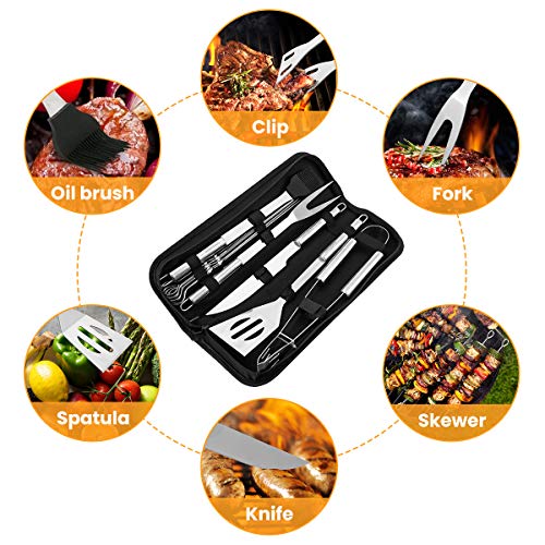 ? ?Premium-Qualität? Die grillbesteck set bestehen aus professionellem Edelstahl, der langlebig und hitzebeständig ist und sich nicht verbiegt oder bricht. Der lange Griff ist breit und vom Lebensmittel weg verlängert, wodurch er hitzebeständiger wird. Er ist robust genug für Halt, der sich nicht verbiegt oder schmilzt und Ihre Hände sicher hält.. ? ?10-teiliges Grillzubehör Grillset? Dieses BBQ grillbesteck tool set enthält alles, was Sie zum Grillen benötigen, in einer Packung. Dazu gehören eine Fleischgabel, eine Grillzange, einen Spatel, einen Backpinsel, einen Grillmesser und 5 Grillspieße .. ? ?Tragbar?Unser Grill-Set mit einer Oxford-Stofftasche geliefert, die leichtkompakt und tragbar. Das Innere ist mit Klettverschluss und Gummiband ausgestattet und sorgt dafür, dass diese Werkzeuge ordentlich aufbewahrt werden, egal ob Sie zu Hause oder auf dem Campingplatz ein Picknick genießen. Diese grillbesteck sind leicht zu reinigen und können auch in die Spülmaschine gestellt werden. Die Aufhängeöse am Ende erleichtert das Platzieren nach dem Gebrauch oder beim Trocknen.. ? ?Perfektes Geschenk? Dieses edelstahl grillbesteck ist vielseitig einsetzbar für Aktivitäten im Innen- und Außenbereich, einschließlich tägliches Kochen, Wandern, Camping und Feiern im Garten. Unser Grillwerkzeug-Set ist mit seiner guten Politur die perfekte Wahl für Feinschmecker, Grillfans, Köche und Campingliebhaber, die häufig Dinnerpartys veranstalten.. ??100% Garantie? - Wenn Sie nach Erhalt der Ware nicht zufrieden sind, kontaktieren Sie uns bitte umgehend und können Sie diesen zurücksenden und erhalten einen kostenlosen Ersatz. wir werden Ihnen innerhalb von 24 Stunden antworten.