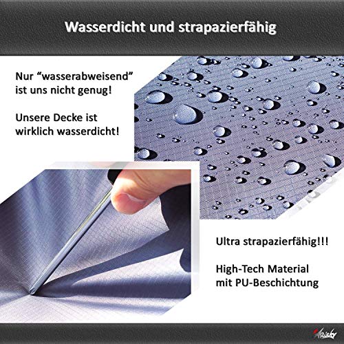? All IN ONE Decke und Regenschutz Notfall-Regencape / Geheimfach für Wertsachen – einfach umklappen und unter der Plane verstecken / 4 Sand-Taschen / 4 Eckschlaufen / 4 Heringe zum Verankern. ? WASSERFEST UND SANDABWEISEND Diese Outdoordecke lässt kein Wasser durch! Outdoor Teppich oder Reise Zubehör Gadget zum Camping als Schutzmatte, Zelt-Plane oder Tarp-Zelt - einfach abwaschbar. ? LEICHT UND KOMPAKT Für 4-6 Personen - Spieldecke für Kinder / 200 x 140 cm groß / nur 340g / Perfekt im Urlaub: Sand abschütteln, zusammenlegen und mit Tragetasche am Rucksack befestigen. ? CAMPING ZUBEHÖR Reisedecke zum Fahrrad-Fahren, als Auto Zubehör oder Sitzkissen outdoor im Park oder am Strand / Kofferraum-Matte oder Hundedecke / Als Stranddecke, Strandmatte oder Strandlaken. ?PREMIUM QUALITÄT Langlebigkeit durch erstklassige Verarbeitung und extra strapazierfähiges High-Tech Material / Einfach zu pflegen und zu reinigen - Maschinen-waschbar - Perfekt als Geschenk