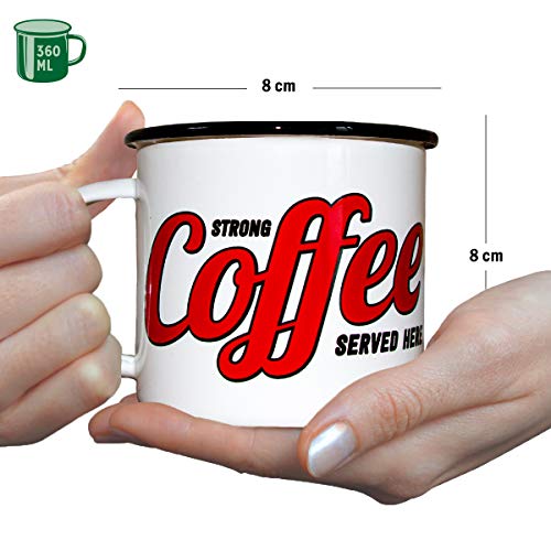 Nostalgic-Art, Retro Emaille-Tasse, Strong Coffee Served Here – Geschenk-Idee für Kaffee-Liebhaber, Camping-Becher, Vintage Design, 360 ml