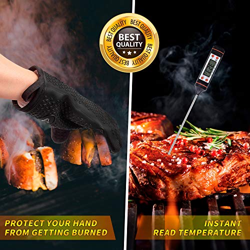 ?Tolles Grill-Geschenk-Set?Wenn Sie ein tolles Geschenk für Ihre Familie, Freunde oder Ihren geliebten Grillmeister vorbereiten möchten, suchen Sie nicht weiter. Grillbegeisterte haben unser Geschenkset schon immer gefallen, egal ob Vatertag, Erntedankfest, Weihnachtstag oder Geburtstage von Familie und Freunden.. Grillzubehör für den Urlaub: Bereiten Sie neue Grillwerkzeuge für Ihr nächstes Familienessen vor. Dieses ganze Set beinhaltet den notwendigen 4-in-1 Pfannenwender, Zange, Gabel, Messer, Backpinsel, Salzstreuer und kommt mit den neuesten Fleischkrallen, XL-Handschuh, Thermometer und einer großartigen, robusten Reinigungsbürste. Noch nie war der Einstieg einfacher, auch für Einsteiger.. ? Die wirklich nützliche Grill-Reinigungsbürste ? Dreimal mehr Borsten als die traditionelle Grillbürste, der Griff ist 44,5 cm lang und der Bürstenkopf hat einen starken Schaber. Diese Reinigungsbürste mit extra scharfem Edelstahl-Schaber kann mit ein wenig Aufwand jeden hartnäckigen Schmutz leicht schrubben.. ?Verbessertes Material und Struktur?Alle Edelstahl-Werkzeuge sind matt poliert und extra dick, stark und langlebig. Die Fleischkrallen in diesem Grillwerkzeug-Set sind solide Struktur und super leicht zu reinigen. Die Grillbürste mit Schaber ist strapazierfähig und 44,5 cm lang. Der wärmeisolierte Handschuh ist für große Hände konzipiert und extrem strapazierfähig.. Praktische Aufbewahrung und einfache Pflege: Im Vergleich zu sperrigen und leicht beschädigten Aluminiumgehäusen hält unsere wasserdichte Oxford-Aufbewahrungstasche mit starken Nähten das Grillzubehör ordentlich organisiert und besser geschützt. Aufhänger sind für einfache Lagerung im Lieferumfang enthalten und das Grillwerkzeug in Lebensmittelqualität ist leicht mit warmem Seifenwasser zu reinigen und sie sind auch spülmaschinenfest.