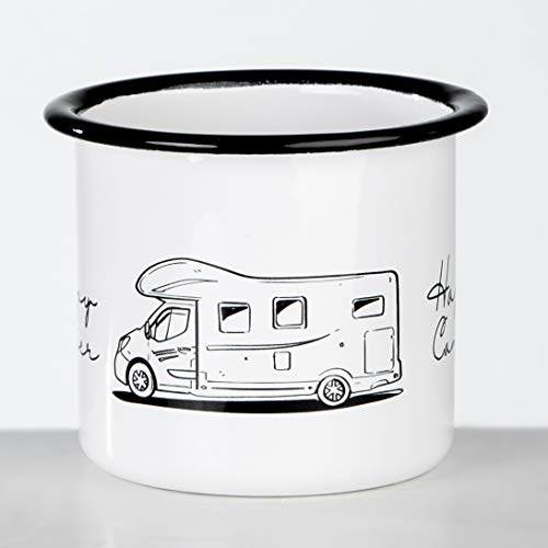 Happy Camper | Hochwertiger Emaille Becher mit Wohnmobil Alkoven Motiv | leicht und bruchsicher | für Camping und Camper | von MUGSY.de