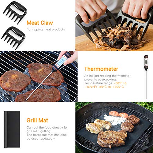 1, Was kann Man bekommen: 1*Fleischthermometer, 1*BBQ-Zange, 1*BBQ-Spachtel, 1*BBQ-Gabel (lang), 1*Grillmatte, 2*Pinsel, Drahtbürste, 4*Kabob Spieße, 8*Maishalter, 2 *Gewürzflasche, 1*handschuhe, 1*Fleischkrallen, und 1*Aufbewahrungstasche. Alle in eine Tasche.. 2, Wir haben auch eine Aufbewahrungstasche. Sie können alle Sachen in die Tasche legen. Ganz einfacher zu tragen. Perfekt für Gärten und Camping. Leicht zusammen zu sammeln und leicht zu reinigen.. 3,Hochwertiger Edelstahl, der nicht rostet. Besonders entworfen, so dass der Griff des Werkzeugs ist nicht so heiß. Das Grillzubehör verfügt auch über kleine Löcher zum Aufhängen. Sie können sie im Grill oder in der Küche aufhängen. Bequemer zu bedienen.. 4,Mit einem kompletten Grill Werkzeugset sind Sie ein perfekter Griller. Sie können Ihre Freunde zu einer Party zu Hause einladen. Genießen Sie den Spaß am Grillen.. 5,Wenn Sie Fragen haben, kontaktieren Sie uns bitte und wir werden Ihnen eine zufriedenstellende Antwort geben.