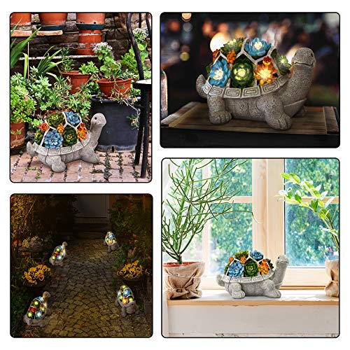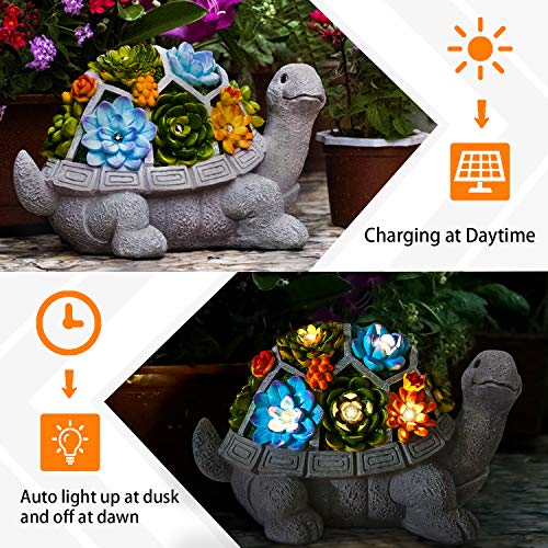 SCHILDKRÖTE GARTEN DEKO: Eine Schildkröten-Skulptur aus Harz mit solarbetriebenen Lichtern und mit Blumenornamenten geschmückt, fühlt sich an wie eine echte niedliche Schildkröte, die im Garten lebt. Sie bringt mehr Energie und Farbe in Ihr Haus.. SOLAR BETRIEBEN: Kein ständiger Batteriewechsel nötig. Diese dekorativen Außenfiguren werden vollständig von der Sonne gespeist. Wenn sie tagsüber voll aufgeladen sind, können sie nachts etwa 5-10 Stunden lang in Betrieb sein.. HALTBAR & WETTERBESTÄNDIG: Hergestellt aus zähem Harz, staub- und wasserdichten Materialien, können Regen, Schnee oder sengende Sonne aushalten, ohne Risse zu zeigen, zu verblassen oder zu rosten.. LEICHT ZU BENUTZEN: Schalten Sie vor dem ersten Gebrauch den EIN-Schalter an! Lassen Sie die Schildkrötenstatuen einfach eingeschaltet und stellen Sie sie tagsüber in die Sonne. Die Automatik schaltet sich, wenn es dunkel wird ein und in der Morgendämmerung wieder aus.. WUNDERSCHÖNES GESCHENK: Diese Schildkrötenfiguren sind 29,2 x 11,4 x 16,5 cm groß. Ob Sie nach Geschenken für Einweihung, Weihnachten, Geburtstag oder anderen Feiertagen suchen, diese Solargarten-Statue wird Ihre beste Wahl sein.