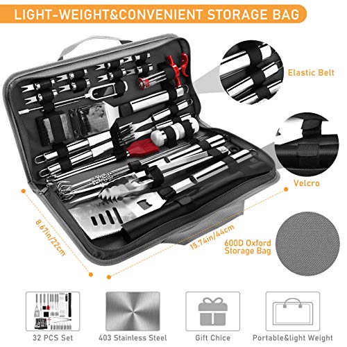 [ HOCHWERTIGER EDELSTAHL ] - Das Duerer-Grillset besteht aus lebensmittelechtem Edelstahl, BPA-frei. Die Oberfläche mit Lebensmittelkontakt besteht aus Edelstahl 403. Es ist rostfrei und wird niemals brechen. Der ergonomische Grillgriff und seine Hitzebeständigkeit sorgen dafür, dass Sie bei hohen Temperaturen sicherer grillen können. Super langlebig und spülmaschinenfest.. [ KOMPLETTES UND PROFESSIONELLES BBQ SET ] - Die praktischsten Grillwerkzeuge, die Sie benötigen, sind in unserem Grill-Set enthalten. Langstieliger Spatel, Gabel, Zange, Fleischthermometer, Fleischinjektor, Grillmatte, Silikonbürste, Grillbürste, Bürstenkopf, 8 * Spieße, 8 * Maishalter, 2 * Pfeffer- und Salzstreuer, 2 * Steakgabeln, 2 * Steak Messer, Mit 600D Oxford Aufbewahrungstasche, die Ihr Grillzubehör ordentlich organisiert und besser schützt.. [ BEQUEME AUFBEWAHRUNG UND REINIGUNG ] - Im Gegensatz zu anderen Aufbewahrungsbeuteln wird unser Grillzubehör mit einer leicht zu tragenden 600D Oxford-Tasche geliefert. Jedes Zubehör ist mit einem elastischen Gürtel und einem Klettverschluss befestigt. Dies ist eine ausgezeichnete Wahl für den Transport oder die Aufbewahrung von Grillzubehör. Alle Grillgeräte sind mit einem Aufhängering ausgestattet. Einfach zu lagern. Alle Grillzubehörteile können sicher in der Spülmaschine gereinigt werden.. [ PROFESSIONELLER ALS ANDERE MARKEN ] - Unser Grillset enthält mehr professionelles Grillzubehör als andere. Die Grillreinigungsbürste kann alle Arten von Grills reinigen und wirft keine Haare ab. Der Fleischinjektor sorgt dafür, dass Ihre Mahlzeit saftiger, zarter und köstlicher ist. Ein digitales Grillthermometer informiert Sie darüber, wie gut das Essen gekocht ist. Kann für jeden Anlass verwendet werden. Es wird Ihr Grillerlebnis auf ein ganz neues Niveau bringen.. [ DAS BESTE GIF ] - Das hochwertige Grillset und das perfekte Verpackungsdesign machen es perfekt für Vatertag, Geburtstag, Weihnachten und jedes Festival. Jeder Grillkoch-Enthusiast muss mit den besten Grillwerkzeugen und -zubehör von Duerer ausgestattet sein, und genau das bekommt jemand mit diesem Grill-Kit. Damit Sie täglich kochen, im Freien grillen und Camping genießen können.