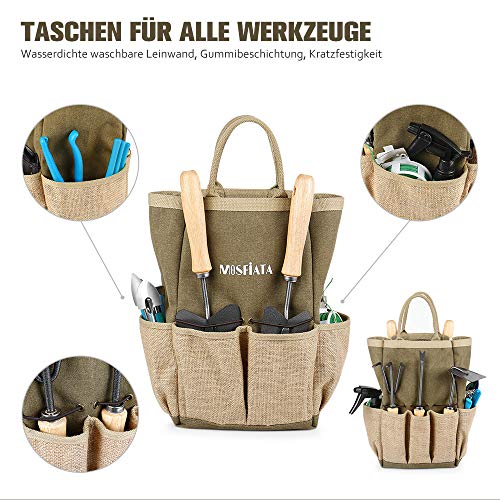 ?12-teiliges Garten-Toos-Set?: Alle 12-teiligen Garten Werkzeuge werden in einer Tasche aufbewahrt. Einschließlich Schaufel, Rechen, Jäten, Sprühflasche, Tragetasche usw. Das MOSFiATA-Gartenwerkzeug-Set kann alle Ihre Gartenanforderungen erfüllen.. ?Hohe Qualität und Langlebigkeit?: Die 5-teiligen großen Gartengeräte aus kohlenstoffhaltigem Stahl. Sie sind solider und langlebiger. Das wirtschaftliche Design der Griffe aus importierter Qualität ist härter und stabiler. Sie können es lange verwenden, machen Sie sich keine Sorgen um die Qualität.. ?Tragbar und wasserdicht?: Auf der Vorder- und Rückseite der Tragetasche befinden sich mehrere Aufbewahrungstaschen. Alle 12-teiligen Handkits können sehr tragbar verpackt werden. Diese Einkaufstasche besteht aus waschbarem Segeltuch und einer Gummibeschichtung. Sie ist wasserdicht, hart und langlebig .. ?Ergonomisches Design?: Alle Gartengeräte im Werkzeugsatz sind ergonomisch gestaltet. Der Griff verfügt über eine hervorragende Rutschfestigkeit, die die Ermüdung Ihrer Hände und Arme verringert und Ihnen ein angenehmes Erlebnis bietet. Sie und Ihre Familienangehörigen können die Gartenarbeit genießen und Zeit sparen.. ?Rückerstattung und Garantie?: 30 Tage Rückerstattung und 1 Jahr Ersatzgarantie - bitte kontaktieren Sie uns kostenlos, wenn Sie ein Problem haben. Wir werden Ihnen alle Probleme so schnell wie möglich beantworten und lösen!