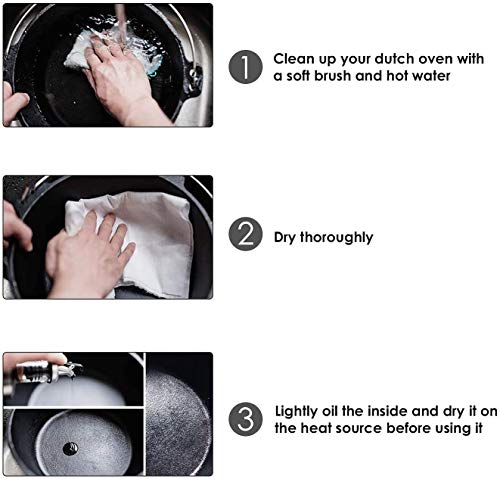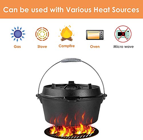 Sicher & Praktisch: An der Position des festen Henkels sind zwei Löcher angebracht: Die Befestigung des Henkels rechts und links am Oven ist optimal gelöst, eine gleichmäßige Austarierung ist immer gewährleistet. Der Dutch Oven hat einen spiralen Henkel: Durch den spiralförmigen Henkel kann effektiv verhindert werden, dass der Topf Wärme auf den Henkel überträgt. Wenn Sie also den heißen Topf tragen, müssen Sie sich keine Sorgen machen, dass Sie sich durch die Hitze die Hände verletzen. Hervorragende Wärmeübertragung: Aus Gusseisen. Durch gute Wärmeübertragung und spezielle Oberflächenstruktur von Gusseisen kann Wärme effizient gespeichert und übertragen werden. Sie können damit leicht kochen, schmoren, braten, grillen und backen im Freien. Fügen Sie einfach Holzkohle, oder geröstete Briketts auf den Deckel und unter den Topf , dann arbeitet der feuertopf. Durch den schweren Deckel und das epitaktische Design kann der Dutch Oven die Wärme besser sammeln und das Kochen effektiv beschleunigen. Der Deckel hat einen Schlitz für das Thermometer. Mit dem Thermometer können Sie immer die Temperatur im Topf sehen, ohne den Deckel anzuheben. Schließlich beträgt das Fassungsvermögen unseres Topfes 5,46 Liter, das Fassungsvermögen des Deckels 2,54 Liter und das Gesamtvolumen 8 Liter, das von 5-8 Personen verwendet werden kann. Vielseitig: Der Topfkörper und der Deckel haben Füße: Bei Verwendung des Topfes sind keine zusätzlichen Halterungen erforderlich, und Holzkohle kann direkt auf den Topfboden gestellt werden. Darüber hinaus hat der Deckel ein großes Fassungsvermögen: Er kann als Pfanne oder Teller verwendet werden. Drittens inkl.Deckelheber: Beim Aufheizen des Topfs können Sie den Heber verwenden, um den Deckel jederzeit sicher und bequem anzuheben.. Verwendung: Sie können mit den Dutch Oven Gulaschsuppe, Lasagne, Schaschlik, die geschmorte Rehkeule und das Gulasch usw. machen. Nebenbei können Sie auch Feuertopf verwenden, um Nachtisch, Kekse, Brot, Pizza und sogar Kuchen zuzubereiten.
