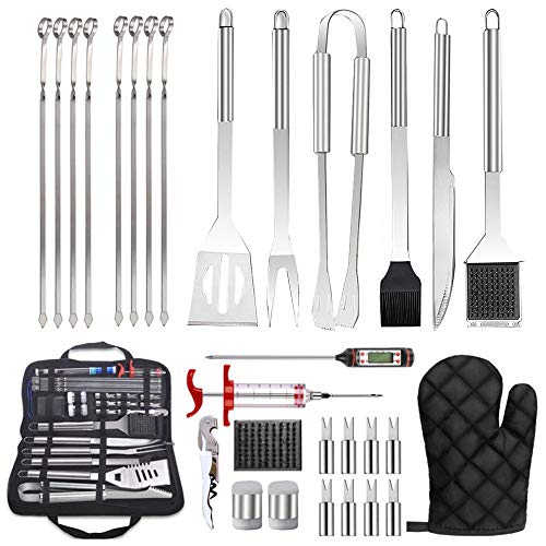 ?????BESONDERES DESIGN?-Jeder Griff und jede Verriegelungszange sind zur einfachen Aufbewahrung mit Aufhängeringen ausgestattet. Der geschlitzte Spatel mit Korkenzieher hat gezackte Kanten zum Schneiden und Zartmachen von Fleisch.. ????? PREMIUM QUALITÄT GRILLBESTECK ? - Dieses Grillset aus hochwertigem Edelstahl mit hitzebeständigem Gummi-Griff ist robust genug, um alle Grillanforderungen zu erfüllen. Rostet, verbiegt oder bricht nicht wie andere Marken. Leicht zu reinigen und spülmaschinenfest.. ?????SONDERDESIGN GRILLBESTECK IM KOFFER? - Um Verbrennungen und Rutschgefahr beim Grillen zu vermeiden, ist jedes Grillwerkzeug in diesem grillbesteck set mit einem länglichen, gummierten Kunststoffgriff gefertigt. Die Zange verfügt über ein verblüffendes Humanisierungs-Verschlussdesign für eine einfache Lagerung. Für zusätzlichen Komfort ist jedes Grillwerkzeug mit einem Aufhängehaken aus Metall ausgestattet. Alle grill zubehör bleiben in dem leichten Aluminium-Aufbewahrungskoffer geschützt.. ?????MACHEN SIE DAS PERFEKTE GRUBENGESCHENK?-Es ist ein großartiges Geschenk für jeden Grillliebhaber oder inspirierenden zukünftigen Grillmeister! Dieses luxuriöse Grillwerkzeugset ist in einer Geschenkbox verpackt. Dies ist ein ideales Geschenk für besondere Anlässe wie Geburtstage, Feiertage, Vatertag, Weihnachten, Hochzeiten, Einweihungsparty und Jubiläum.. ?????INNEN- UND AUSSENBEREICH ?- Das Barbecue-Toolkit ist ideal für das tägliche Kochen und Kochen im Freien, z. B. für Grillpartys im Garten, Familienfeiern, Camping und Schleppen. Verwenden Sie dieses Zubehör, um das Grillmenü zu Hause oder auf Reisen zu vervollständigen