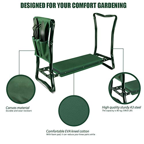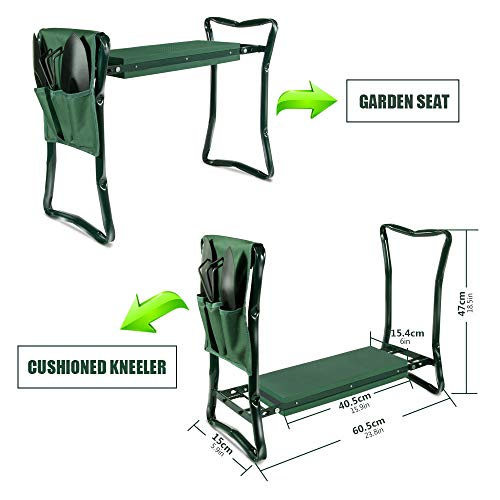 Diese Garten Kniebank bietet einen guten Service für die Gartenarbeit. Sie können sich hinknien und sich auf das EVA-Schaumkissen setzen. Die Garten Kniebank schützt die Knie und Gelenke und schützt die Kleidung vor Feuchtigkeit und Staub.. Zusammenklappbar und leicht zu tragen - der klappbar Knie und Sitzbank lässt sich leicht öffnen und schließen. Klappmaß: 60 x 26 x 12, 5 cm, sehr kompakt, leicht zu tragen und aufzubewahren.. Hochwertiges Material - Der Rahmen besteht aus Stahlrohr. Das EVA-Schaumpolster (37 x 14 * 1,8 cm) ist weich und bequem, Schützt die Knie und hält sie warm.. Hohe Belastbarkeit - Die maximale Belastbarkeit der Gartenhocker beträgt 150 kg. Der Stützrahmen aus Stahl bietet starken Seitenhalt und reduziert den Taillendruck. Er ist auch eine ideale Stehhilfe. Es ist auch möglich, die Kinder den Garten genießen zu lassen.. Das Paket enthält: 1 * Garten Kniebank, 1 * Gartenwerkzeugtasche, 3 * Gartenwerkzeug,1 * Paar Handschuhe.