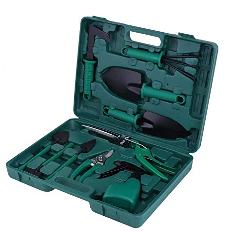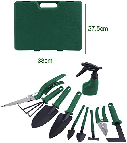 [Multi-function hand tool kit]-very suitable for various tasks, such as digging, weeding, raking grass, weeding, aeration, transplanting, pruning and watering to meet all your requirements for indoor and outdoor use. Just use these gardening supplies to start your gardening journey.. [High-quality materials]-Ergonomic anti-skid handle-Ergonomic anti-skid handle design has excellent comfort, reduces the pulling force on the hand and wrist, making planting easier and faster. Environmentally friendly plastic handle.. [Easy to carry]-The garden tool kit comes with a suitcase with a mold sorting slot, which can better complete and protect your garden tools. Environmentally friendly plastic material, lightweight and easy to carry.. [Beautiful and practical]-The green color of garden tools makes you feel more relaxed and more suitable for your garden environment. The ergonomic design reduces hand and arm fatigue during work, making gardening easier and more enjoyable.. [Perfect Gardening Tool]-The improved gardening tool set is an ideal gift for gardeners. With a stylish look and full-featured tools, your lovers, children and the elderly will love it. These garden tools are lightweight and can be carried around. If you have any questions about our products, please contact us in time, our professional team will give you a satisfactory answer as soon as possible.