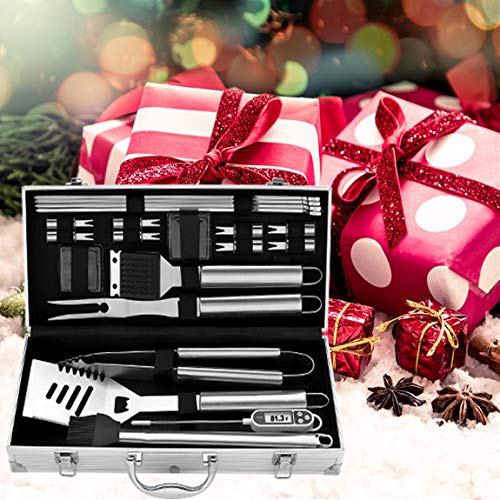Kompletter Grillbesteck für Männer - Spachtel, Gabel, Zange, Backpinsel, Grillpinsel, Fleischthermometer, 2 Bürstenköpfe, 8 Maishalter, 4 Spieße.. Premium Edelstahl Grillset - Konstruktion aus rostfreiem Top-Stahl für lange Haltbarkeit, damit das Grill-Set perfekt für alle Grillbedürfnisse geeignet ist. Spülmaschinenfest.. Tragbar und Praktisch Grillbesteck Koffer - Kompakte Größe ist leicht zu tragen, was perfekt für Camping, Picknicks und Stadtbewohner ist.. Perfektes Weihnachtsgeschenk für Männer Papa Frauen - Großes BBQ-Grillgeschenk stellte am Vatertag, Weihnachten, Geburtstag, Valentinsgruß u. Irgendeine glückliche Gelegenheit ein.. UNÜBERTROFFENE LEISTUNG GRILLBESTECK - Sollten Sie aus irgendeinem Grund nicht mit unserem Küchenmesserset zufrieden sein, kontaktieren Sie uns bitte für eine volle Rückerstattung.