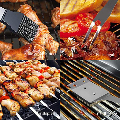 10 pcs Grill-Werkzeuge?Inklusive Grillzange, Grillwender, Grillbürste, 5 pcs Grillspieße,Fleischgabel, Silikon-Backpinsel.. Hochwertiges Grillbesteck Set - Präzise geschmiedet durch Edelstahl von außerordentlicher Qualität, um sicherzustellen, dass Grillzubehör Haltbarkeit, Rost- und Fleckenbeständigkeit aufweisen.. Leicht Zu Tragen:Kommen Sie mit Carry Case - Praktisch für Sie einen Grill-Aktivität zu haben, um durchzuführen , und einfach Ihre Werkzeuge nach dem Fertiggrill zu sammeln.. Ideales Männer Geschenk:Das LIKEY Grillkoffer ist das beste Geschenk für alle, die gerne grillen. Perfektes Geburtstagsgeschenk für Vatertag. Cooles einzigartiges geschenk für Männer.. Freundlicher Kundenservice:Wir gewähren Ihnen eine 100%ige Geld-Zurück-Garantie, sollten Sie mit einem unserer Produkte nicht zufrieden sein. Ihre Zufriedenheit steht bei uns an höchster Stelle.