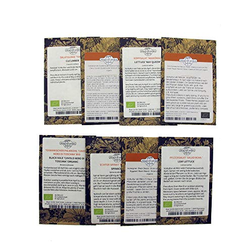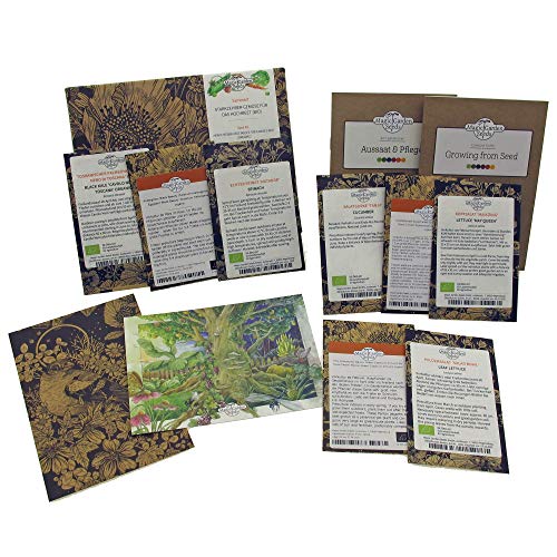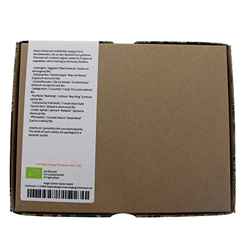 Dieses Bio-Samenset enthält: Auberginen 'Black Beauty', Spitzpaprika 'Marconi Rosso', Cocktailtomate 'Zuckertraube', Salatgurken 'Tanja', Kopfsalat 'Maikönig', Toskanischer Palmkohl 'Cavolo Nero', Echter Spinat 'Matador', Pflücksalat 'Salad Bowl'. Hohe Keimfähigkeit, Samenfeste Sorten (kein Hybrid-Saatgut), 8 Samentütchen pro Geschenkbox, jeweils eines pro Sorte.. Die beiliegende Aussaat-, Anzucht- und Pflegeanleitung von Magic Garden Seeds beschreibt detailliert wie Sie bestmögliche Bedingungen für die Keimung Ihrer Samen und das weitere Wachstum der Pflanzen schaffen.. Sie erhalten liebevoll produziertes Saatgut von zertifizierten europäischen Bio-Betrieben. Natürlich ist auch die MagicGardenSeeds GmbH zertifiziert und regelmäßig geprüft von der Kontrollstelle: DE-ÖKO-037.. Alle enthaltenen Pflanzensorten sind hilfreich zur Verbesserung der Artenvielfalt und gelten als gute Nektar-, Pollen- und Futterpflanzen für nützliche Insekten wie Bienen, Hummeln, Schmetterlinge & Co.
