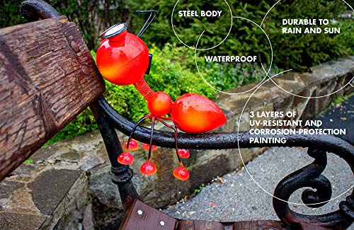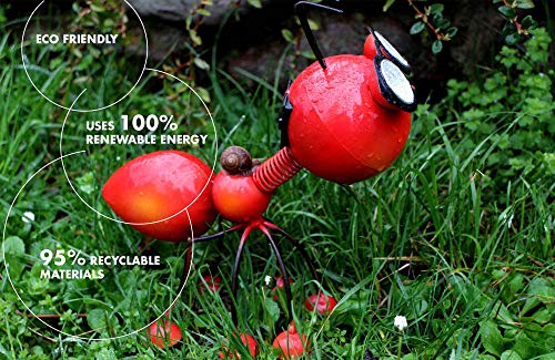 GENIESSEN SIE DIE SCHÖNHEIT IHRES GARTENS: Fügen Sie Ihrem Garten Farbcharme hinzu. Seien Sie ein Architekt Ihres Gartens und Ihrer Terrasse. Das lebendige Design macht die Ameise zum perfekten Landschaftsdekor. Zwei hochwertige, kühle weiße LED-Leuchten (5.500 K) leuchten bis zu 4 Stunden. LANGLEBIG UND WARTUNGSFREI: Einfach einschalten. Der Lichtsensor aktiviert die LED-Lichter automatisch in der Nacht. Das dreischichtige, UV-beständige Anstrichmittel wird nicht durch die Sonnenlicht verblassen und schützt den Stahlkörper vor Rost und Korrosion, die durch Regen und Feuchtigkeit in Ihrem Garten verursacht werden. ALL SEASON GARTEN FREUND FÜR DIE KINDER: Kinder können tagsüber damit spielen und abends ihre leuchtenden Augen genießen. Dieser umweltfreundliche Partner verwendet zu 100% erneuerbare Energie und besteht zu 95% aus wiederverwertbaren Materialien. EINFACHE INSTALLATION: Keine Kabelinstallation. Keine Stromrechnung. Das Ameisenlicht ist zu 100 Prozent solarbetrieben. Das hocheffektive Solarpanel lädt die Batterie innerhalb von 5 bis 8 Stunden im Sonnenlicht voll auf. Der Akku versorgt die Beleuchtung bis zu 4 Stunden lang mit Strom. SEHR TRANSPORTABLES DESIGN: Sie können es überall platzieren. Die 330-g-Metallkarosserie mit 6 Metallbeinen lässt sich leicht auf dem Rasen, auf dem Baum, auf der Fahrbahn, auf dem Tisch, auf der Bank, auf der Terrasse, auf der Fenstersimse im Freien und im Innenbereich platzieren