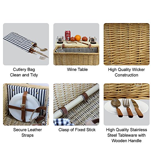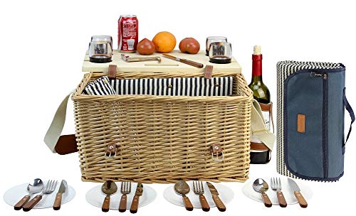 Passende Größe: 44,5 x 27 x 23 cm, großer und starker Picknickkorb mit abnehmbarem Bambus Tisch für Snacks und Wein. Dabei kann man eine 150 x 130 cm großer Picknickdecke finden. Unser Picknickkorb wird von Weidengeflecht mit natürlicher Farbe gewebt, sicher für Ihr Picknick. Bereitet viele Jahre Freude.. Super Bambus Tisch für Wein und Snack: Der Weiden Picknickkorb kommt mit speziellem, und abnehmbarem Bambusweintisch als Deckel. Sie können den Tisch auch separat in den Boden stecken, perfekt für Sand oder Gras. 4 Steckplätze können Ihren Wein sicher in Weingläsern halten, um ein Verschütten zu vermeiden.. Stabile Konstruktion: Das weiche Schulterpolster aus Leder und der verstellbarer Schulterriemen machen es bequem zu tragen und transportieren. Alle Gegenstände sind genietet, um fest an ihrem Platz zu bleiben und sich festzuhalten. Die dicke Leinenklappe mit Druckknöpfen bedeckt den Deckel, der abnehmbar ist und kann auch als Sitzkissen benutzt werden. Darin gibt es eine Tasche für Aufbewahrung des Geschirrs.. Ausgezeichnete Qualität: Das HappyPicnic Picknickkorb Set für 4 Personen bietet 4 Weingläser, die langlebig und hochwertig sind, einige Flaschenhalter, um die Stabilität zu versichern, Griff und Schnalle, Besteck mit Holzgriff.. Picknickkorb Set beinhaltet ein Geschirr Set:4 x Edelstahlbesteck mit Holzgriff, 4 x Teller, 4 x PS-Weingläser, 1 x Flaschenöffner, 1 x herausnehmbarer Bambus-Weintisch, 1 x Geschirr-Aufbewahrungstasche, 1 x Picknickdecke.