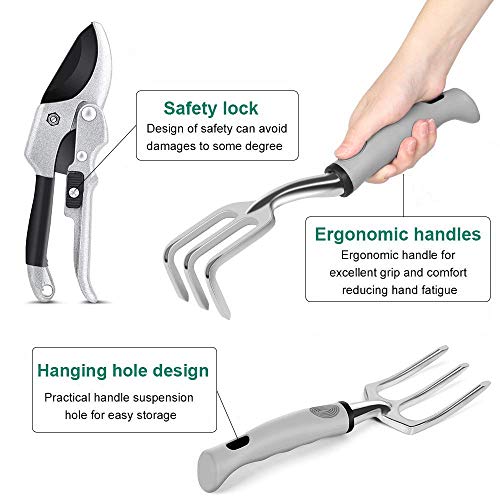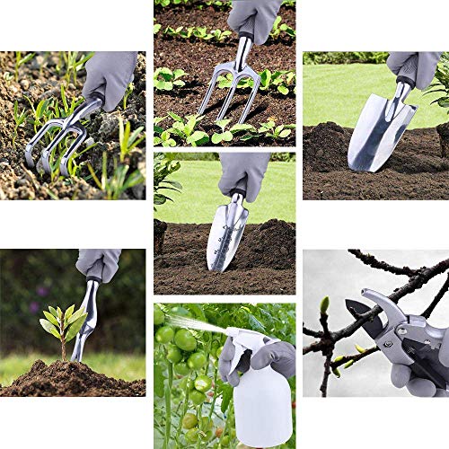 Erstklassiger Edelstahl: Aus rostfreiem Stahl, härter als die traditionelle Aluminiumlegierung auf dem Markt, nicht leicht zu biegen; Nicht einfach zu oxidieren, Korrosionsbeständigkeit ist gut und dauerhaft.. Bequemer Griff: Der ergonomischer Griff ist durch eine Gummihülse geschützt; Der Griff ist groß ,und bietet hervorragenden Komfort, kann Handermüdung reduzieren .Großartig für Kinder und Senioren.. PRAKTISCHE TRAGETASCHE: Eine perfekte Aufbewahrung für die Werkzeuge. So können Sie einfach alles bei sich tragen.Mit der Tragetasche sind die Gartenwerkzeuge leicht tragbar und vor Schmutz und Wasser geschützt.. In einem garten toolkit beinhaltet: Einkaufstasche + Gartenhandschuhe + Sprühflasche + Transplantationsgerät + Handrechen + Spachtel + Grubber + Weeder + Gartenschere. Um alle Gartenanforderungen zu erfüllen.. GROSSE GARTENGESCHENKE :Dies ist eines der besten Geschenke für Gartenliebhaber, einweihungsparty, geburtstage, väter - tag, muttertag, thanksgiving oder weihnachten und andere feiertage.denn es macht die Organisation der Werkzeuge so einfach!