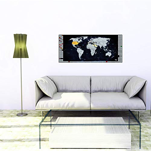 Detailreiche RUBBELWELTKARTE, die bei jedem Hinsehen in Ihnen wunderschöne Reiseerinnerungen weckt und Sie zum Planen und Träumen Ihres nächsten Urlaubs einlädt. MODERNER BLICKFANG an der Wand dank ultrabreitem Format von 100 x 43 cm und elegantem Design. Sensationelles GESCHENK für Freunde und Familie, auf deren überraschte Gesichter Sie sich schon jetzt freuen dürfen. SPASS UND SPANNUNG durch Freirubbeln aller von Ihnen bereisten Länder und Flaggen, die am Rand aufgeführt sind. UMFANGREICHES ZUBEHÖR bestehend aus goldenem Stift, Klebepads, Chip und Werkzeug für die Detailarbeit, damit Sie Ihre Reiseziele auf der Weltkarte markieren und freirubbeln können – inkl. Aufbewahrungsbeutel